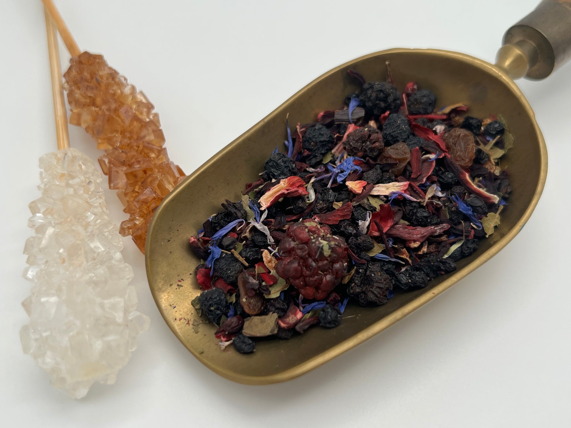 Zutaten: Holunderbeeren (30%), Hibiskusblüten, Brombeeren (17%), Weinbeeren, Aroniabeeren, Johannisbrotstücke, süße Brombeerblätter, Kornblumenblätter.