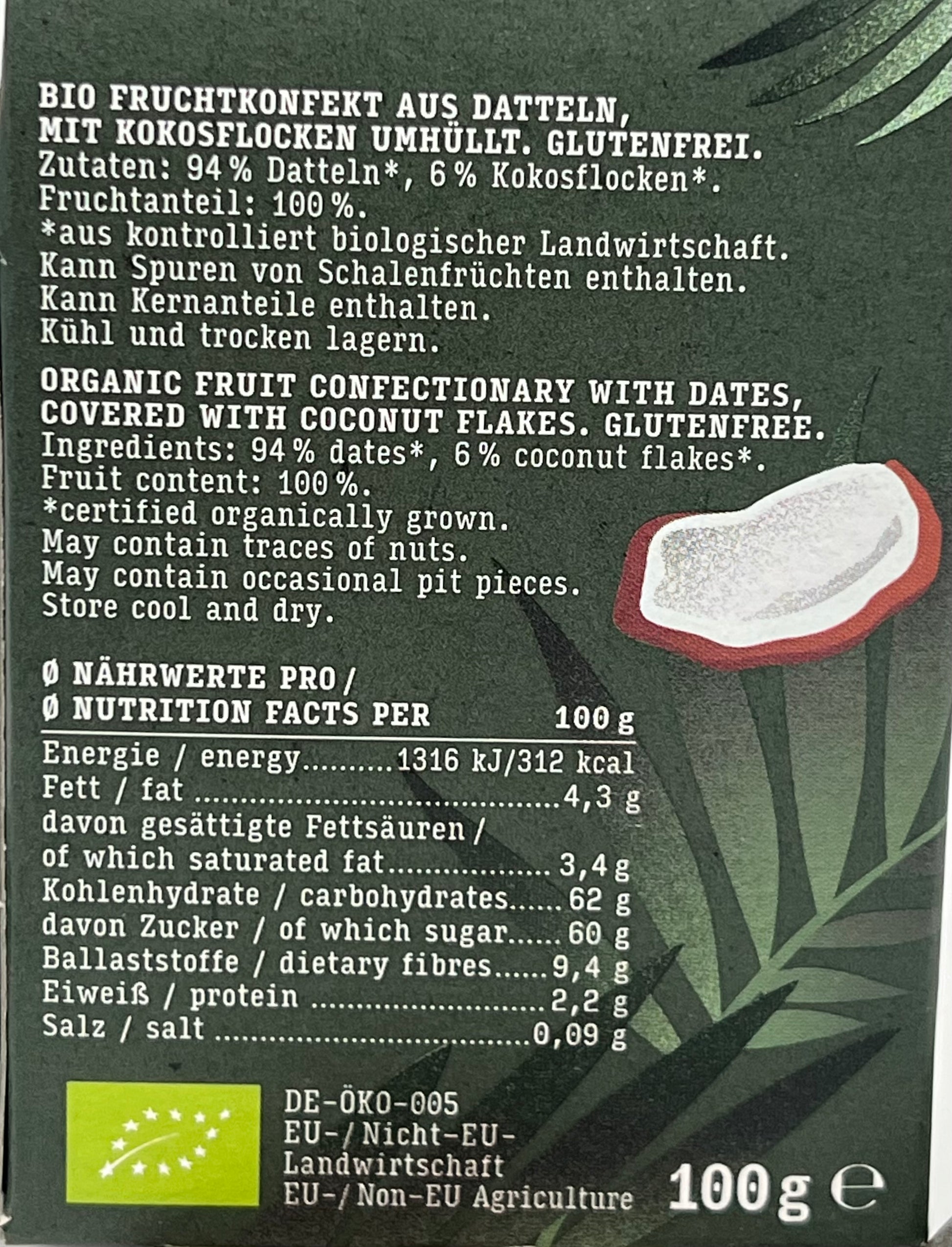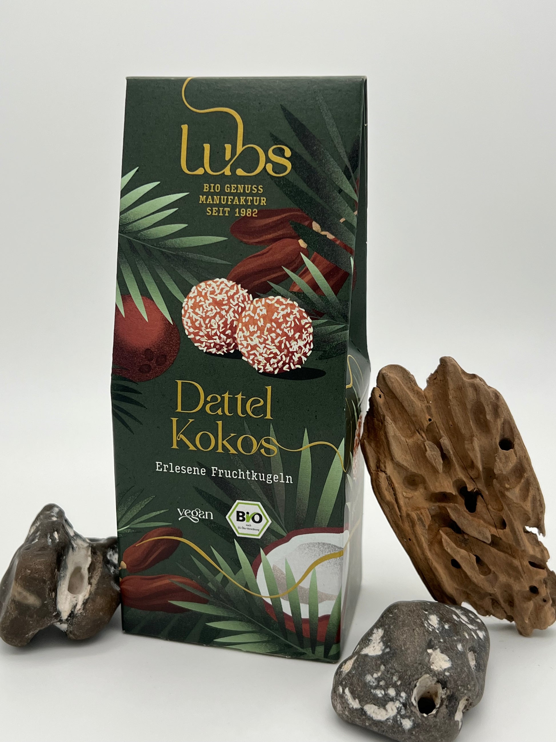 Zartschmelzendes Konfekt ohne Zucker. Erhältlich als Bio Dattel & Kokos oder Bio Dattel & Beeren. Vegan, glutenfrei.